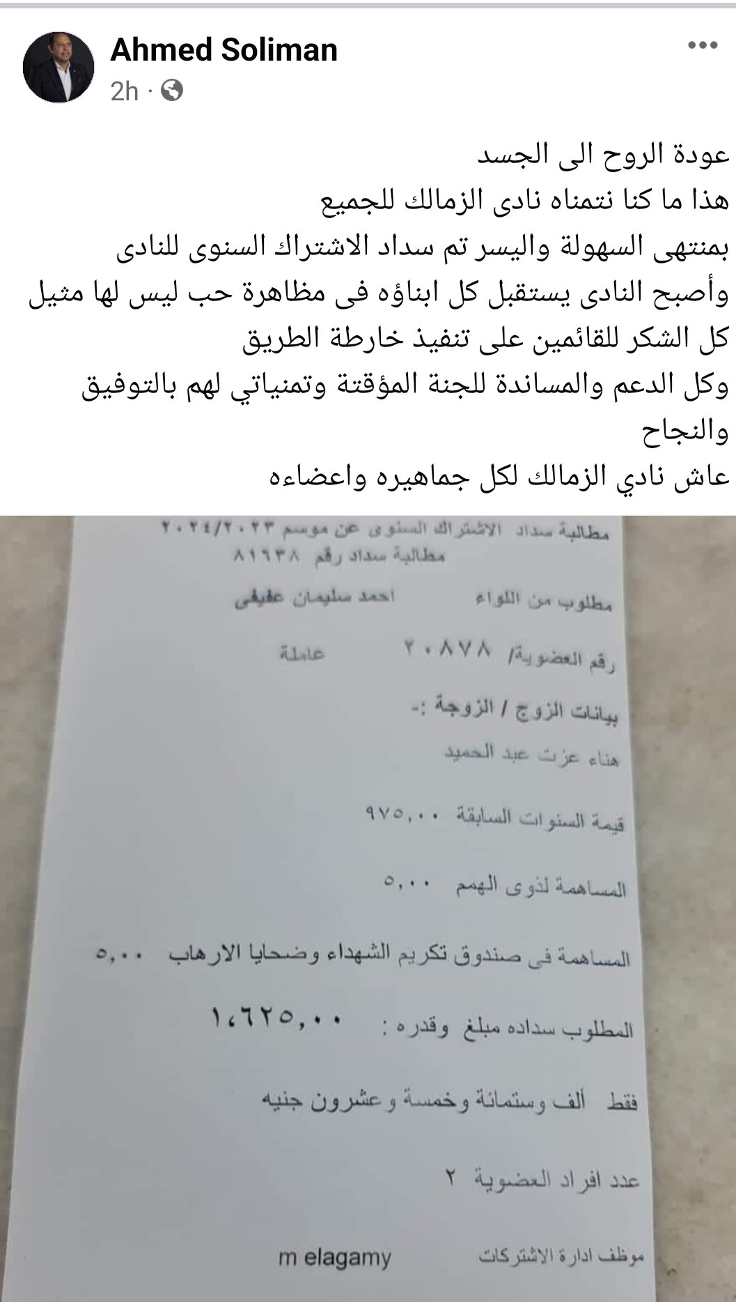 ونشر سليمان عبر حسابه الخاص بموقع التواصل الاجتماعي “فيس بوك” صورة لتجديد عضوية نادي الزمالك، عقب عودته مرة أخرى للنادي عقب رحيل مرتضى منصور، وكتب: “عودة الروح إلى الجسد، هذا ما كنا نتمناه نادي الزمالك للجميع”.