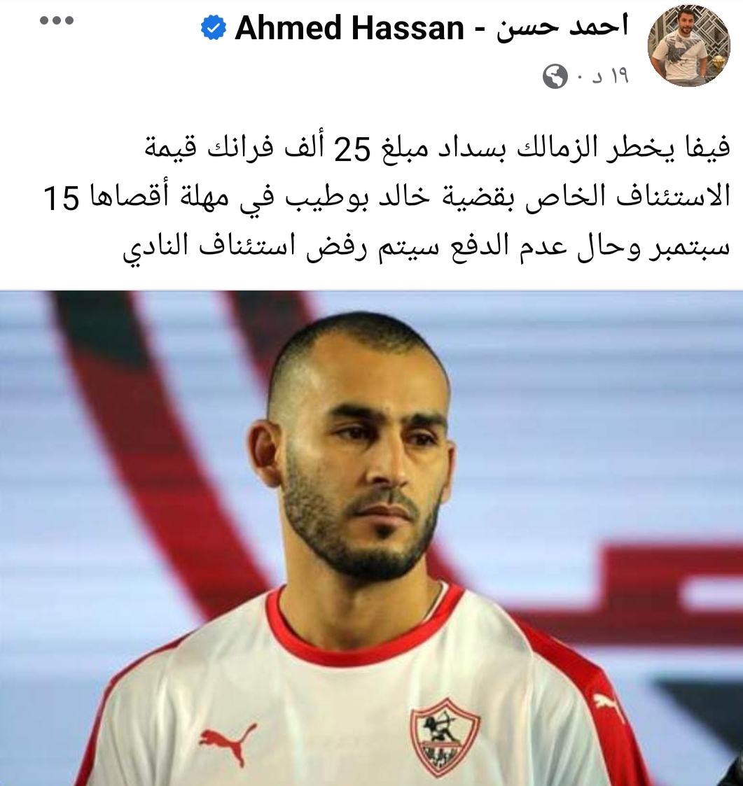 وكتب أحمد حسن عبر حسابه الخاص بموقع التواصل الاجتماعي “فيس بوك”: “فيفا يخطر الزمالك بسداد مبلغ 25 ألف فرانك قيمة الاستئناف الخاص بقضية المغربي خالد بوطيب في مهلة أقصاها 15 سبتمبر وحال عدم الدفع سيتم رفض استئناف النادي”.