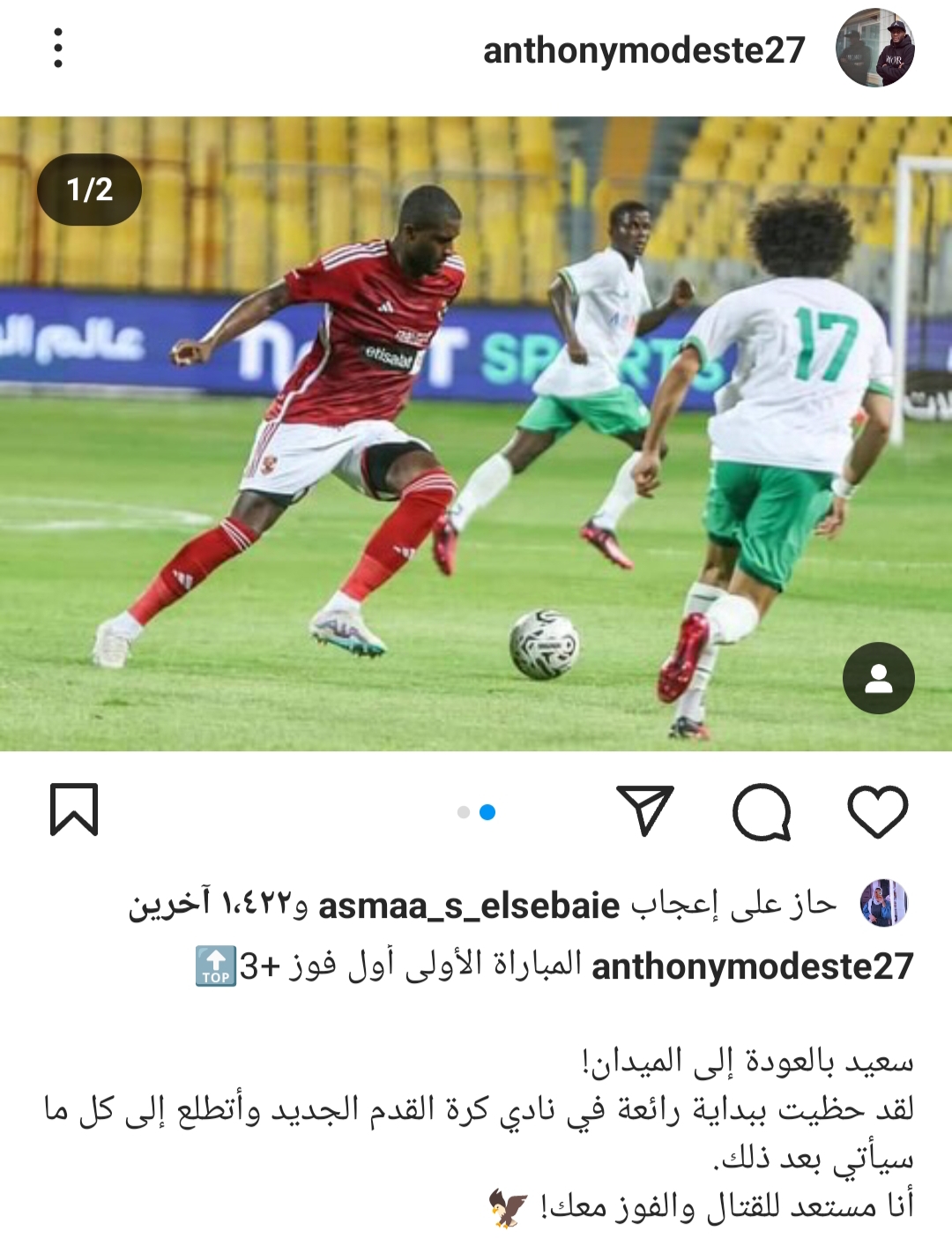 وكتب موديست لاعب الاهلي عبر حسابه الخاص بموقع التواصل “انستجرام”، المباراة الأولى أول فوز 3 نقاط”.