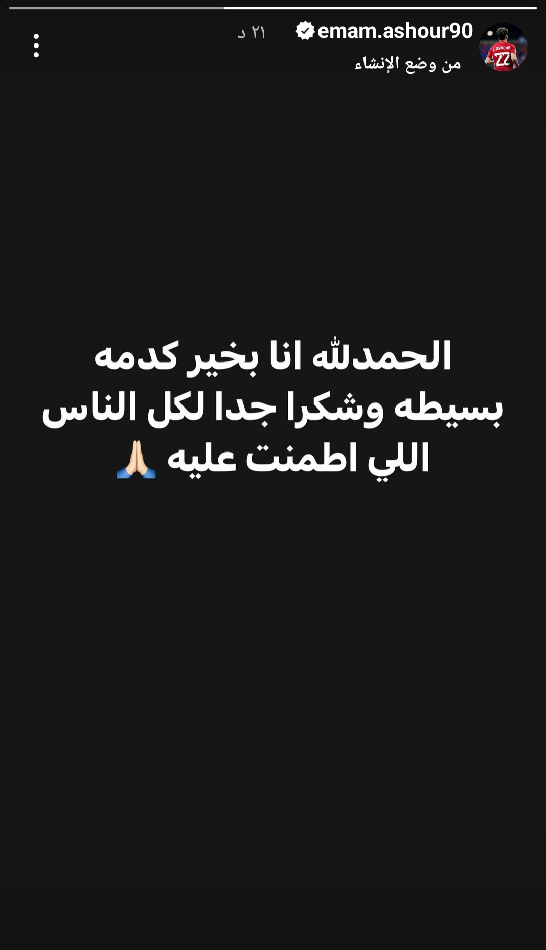 وكتب عاشور عبر الحساب الخاص على حسابه الخاص بموقع التواصل الاجتماعي “انستجرام”، الحمد لله أنا بخير كدمة بسيطة، وشكرا جدا لكل الناس اللي اطمنت عليه”.