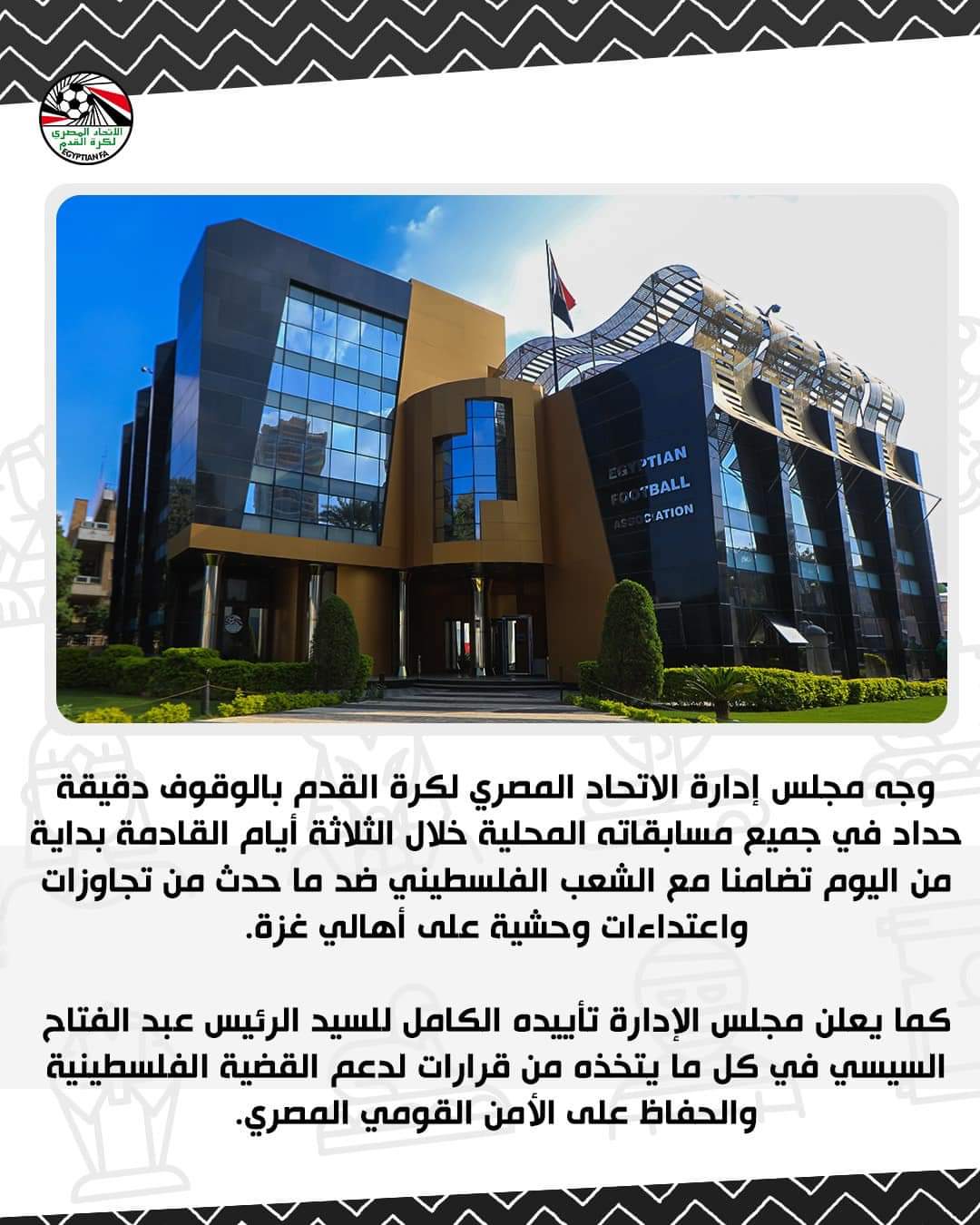 ووفقًا لبيان اتحاد الكرة عبر حساب الرسمي لموقع التواصل الاجتماعي “فيس بوك”: “أعلن مجلس الإدارة تأييده الكامل للسيد الرئيس عبد الفتاح السيسي في كل ما يتخذه من قرارات لدعم القضية الفلسطينية والحفاظ على الأمن القومي المصري.