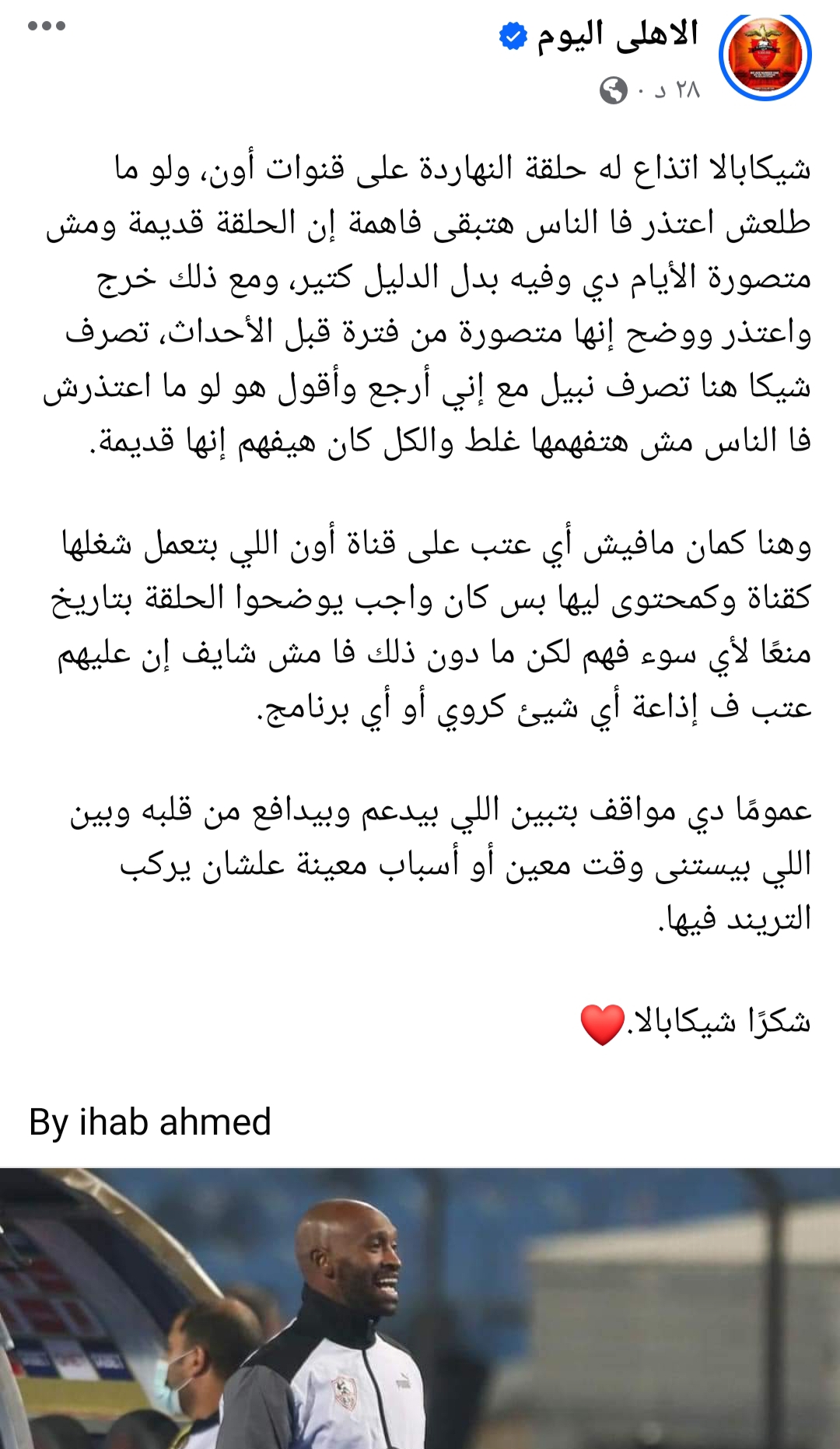 وعلق حساب “الاهلي اليوم”، عبر موقع التواصل الاحتماعي “فيس بوك”: “شيكابالا اتذاع له حلقة النهاردة على قنوات أون، ولو ما طلعش اعتذر فـ الناس هتبقى فاهمة إن الحلقة قديمة ومش متصورة الأيام دي وفيه بدل الدليل كتير”.