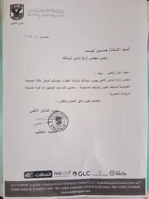 وأرسل مجلس النادي الاهلي برئاسة محمود الخطيب، برقية تهنية إلى نظيره حسين لبيب، متمنيًا له التوفيق ولمجلسه، ودوام التعاون المثمر بين الناديين.