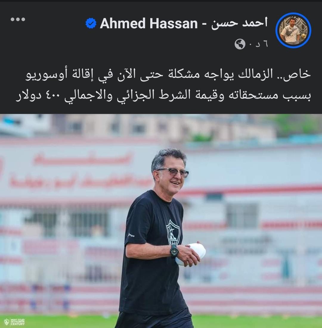 وكتب أحمد حسن، عبر حسابه على موقع التواصل الاجتماعي “فيس بوك”:”خاص.. الزمالك يواجه مشكلة حتى الآن في إقالة أوسوريو بسبب مستحقاته وقيمة الشرط الجزائي والاجمالي ٤٠٠ دولار”.