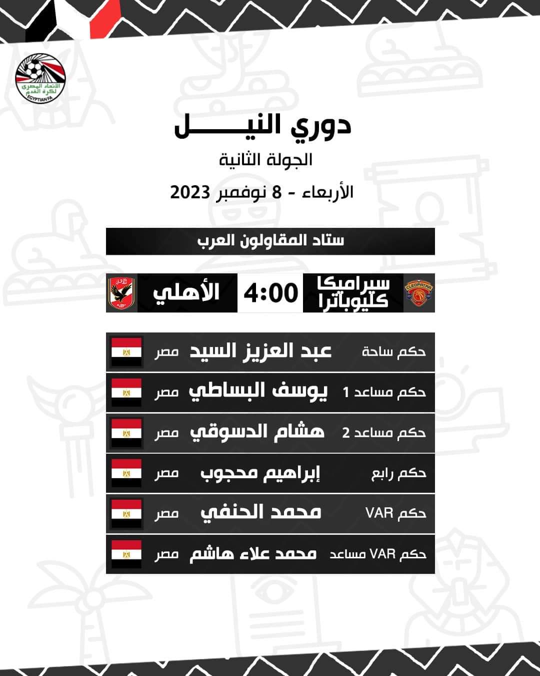 وأسندت لجنة الحكام بالاتحاد المصري، مهمة الإدارة التحكيمية لمباراة الاهلي ضد سيراميكا كليوباترا، للحكم عبد العزيز السيد.