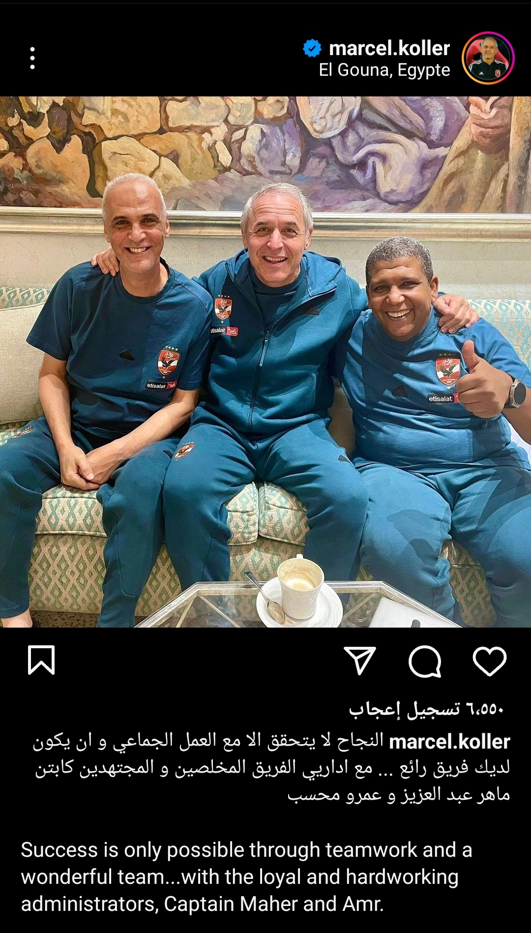 ونشر مارسيل كولر، عبر حساباته الرسمية على مواقع التواصل الاجتماعي، صورة تجمعه بإداريي الاهلي، ماهر عبد العزيز، وعمرو محسب.