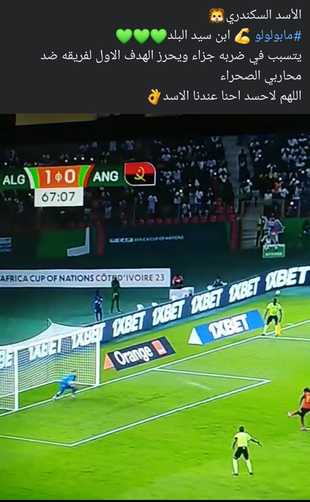 وتحصل مابولولو، على ركلة جزاء في الدقيقة 68، ثم قام بتسديدها، ليحرز هدف التعادل لصالح منتخب أنجولا، أمام الجزائر، ويخطف نقطة ثمينة، في أمم أفريقيا.