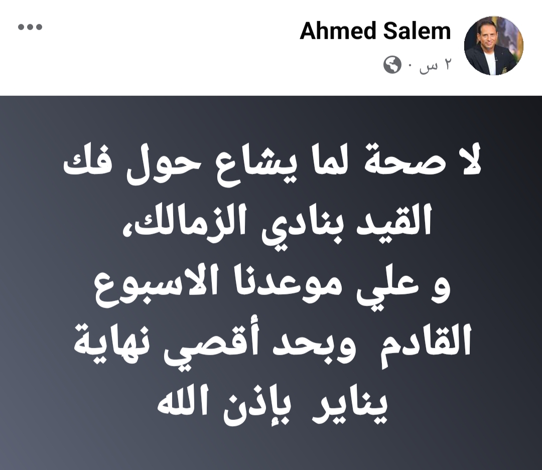 وكتب سالم عبر حسابه الرسمي على فيس بوك: “لا صحة لما يُشاع حول فك القيد بنادي الزمالك، وعلى موعدنا الأسبوع القادم وبحد أقصى نهاية يناير بإذن الله”.