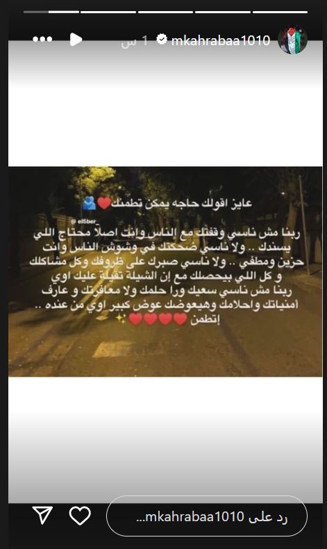 ونشر كهربا، على خاصية “ستور” عبر إنستجرام :”عايز اقولك حاجه يمكن تطمنك ربنا مش ناسي وقفتك مع الناس وانت اصلا محتاج اللي يسندك .. ولا ناسي ضحكتك في وشوش الناس وانت حزين ومطفي .. ولا ناسي صبرك على ظروفك وكل مشاكلك و كل اللي بيحصلك مع إن الشيلة تقيلة عليك اوي ربنا مش ناسي سعيك ورا حلمك ولا معافرتك و عارف أمنياتك واحلامك وهيعوضك عوض كبير اوي من عنده إتطمن”.