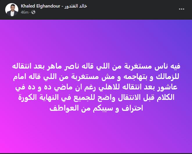 وكتب الغندور، خلال منشور عبر حسابه الرسمي على “فيسبوك” :”فيه ناس مستغربة من اللي قاله ناصر ماهر بعد انتقاله للزمالك وبتهاجمه ومش مستغربة من اللي قاله إمام عاشور بعد انتقاله للاهلي رغم ان ماضي ده وده في الكلام قبل الانتقال واضح للجميع، في النهاية الكورة احتراف وسيبكم من العواطف”.