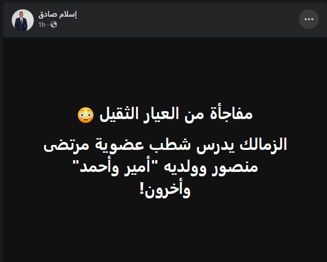 وكتب إسلام صادق عبر حسابه علي فيسبوك “مفاجأة من العيار الثقيل الزمالك يدرس شطب عضوية مرتضى منصور وولديه (أمير وأحمد) وأخرون!”