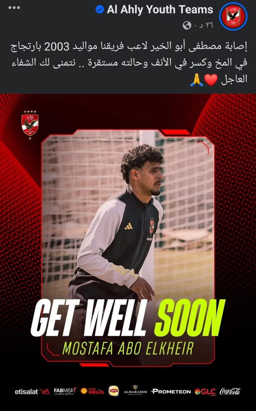 وكتب الحساب الرسمي للنادي الاهلي عبر موقع التواصل الاجتماعي “فيس بوك”:”إصابة مصطفى أبو الخير لاعب فريقنا مواليد 2003 بارتجاج في المخ وكسر في الأنف وحالته مستقرة”.