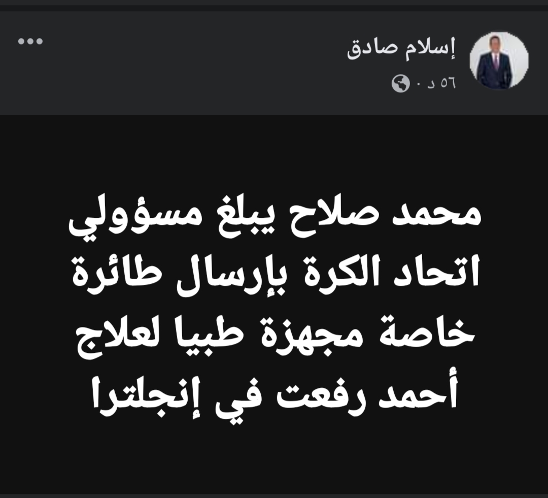 وكتب إسلام صادق، عبر حسابه على موقع التواصل الاجتماعي “فيس بوك”:”محمد صلاح يبلغ مسؤولي اتحاد الكرة بإرسال طائرة خاصة مجهزة طبيًا لعلاج أحمد رفعت في إنجلترا”.
