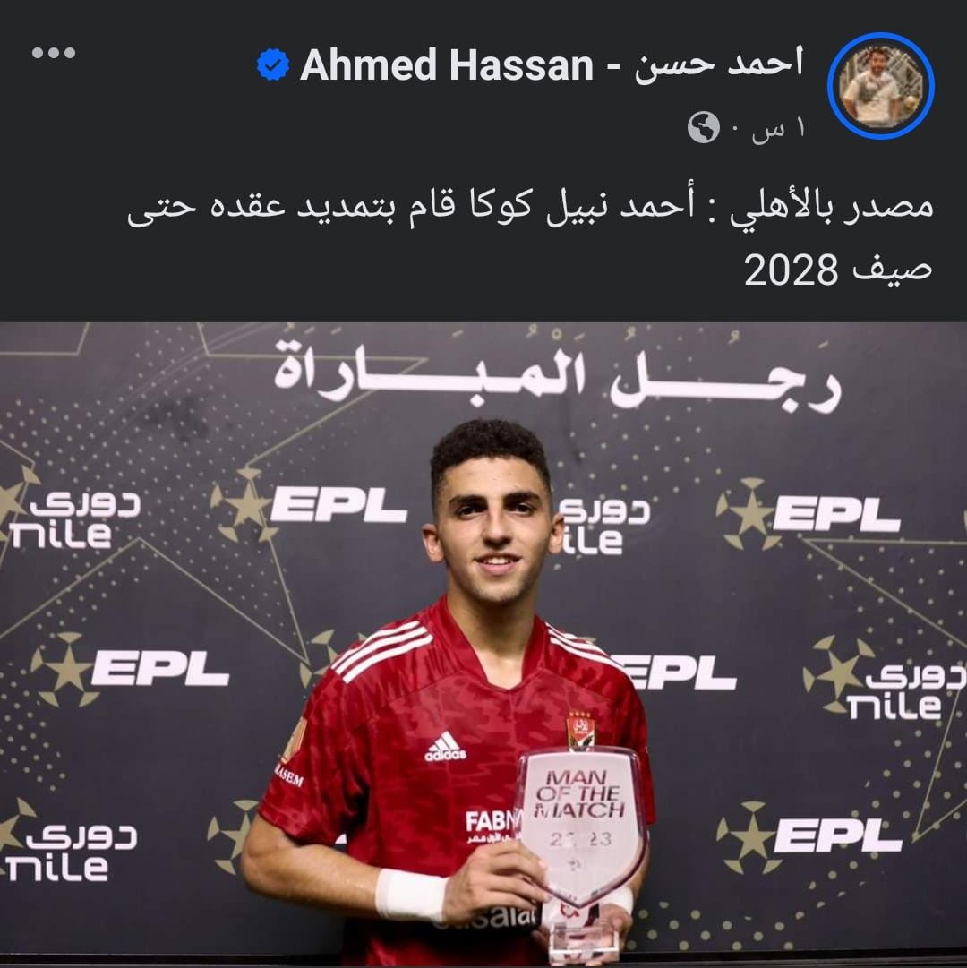 وكتب أحمد حسن، عبر حسابه الرسمي على موقع التواصل الاجتماعي “فيس بوك:”مصدر بالاهلي: أحمد نبيل كوكا قام بتمديد عقده حتى صيف 2028”.
