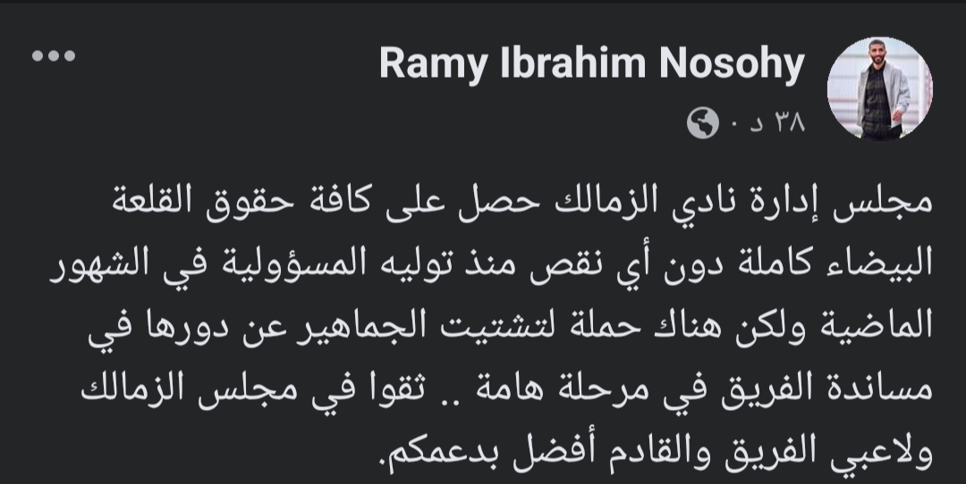 وكتب رامي نصوحي، عبر حسابه الرسمي على موقع التواصل الاجتماعي “فيس بوك:”مجلس إدارة نادي الزمالك حصل على كافة حقوق القلعة البيضاء كاملة دون أي نقص منذ توليه المسؤولية في الشهور الماضية”.