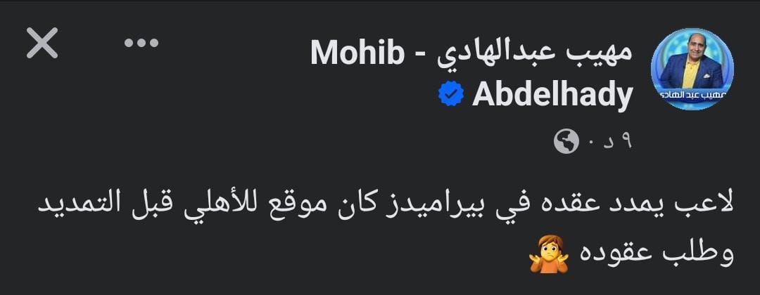 وكتب عبد الهادي، عبر حسابه الرسمي على موقع التواصل الاجتماعي “فيس بوك”:”لاعب يمدد عقده في بيراميدز كان موقع للاهلي قبل التمديد وطلب عقوده”.