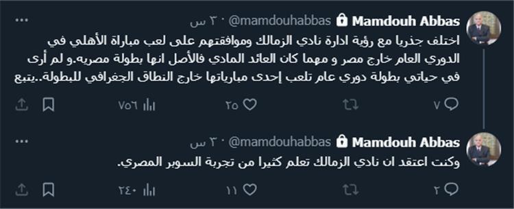 وكتب عباس، عبر حسابه على منصة “إكس”: “أختلف جذريًا مع رؤية إدارة نادي الزمالك وموافقتهم على لعب مباراة الأهلي في الدوري العام خارج مصر.. ومهما كان العائد المادي فالأصل انها بطولة مصرية”.