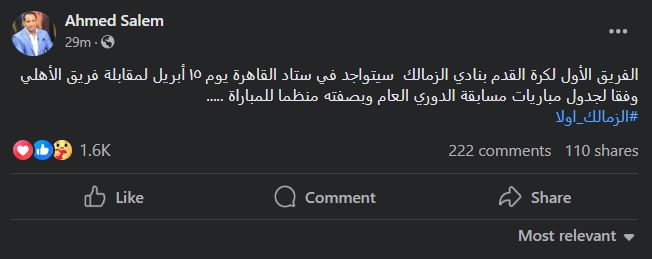 وكتب سالم عبر صفحته على موقع التواصل الاجتماعي: “الفريق الأول لكرة القدم بنادي الزمالك سيتواجد في ستاد القاهرة يوم ١٥ أبريل لمقابلة فريق الأهلي وفقا لجدول مباريات مسابقة الدوري العام وبصفته منظما للمباراة”.