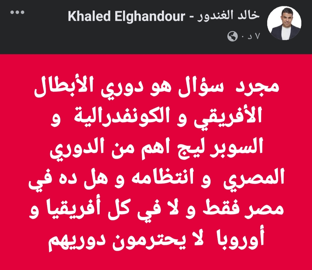 وكتب الغندور، عبر حسابه الرسمي على موقع التواصل الاجتماعي “فيس بوك”:”مجرد سؤال هو دوري الأبطال الأفريقي و الكونفدرالية و السوبر ليج أهم من الدوري المصري و انتظامه”.