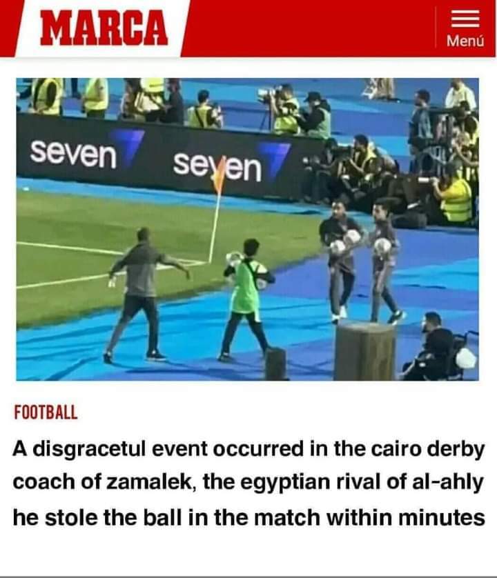 وتظهر الصورة المتداولة المنسوبة لـ “ماركا الإسبانية”، أنها تصف واقعة إخفاء الكرات من جانب الزمالك في مواجهة الاهلي، بأنه حدث مشين في ديربي القاهرة.
