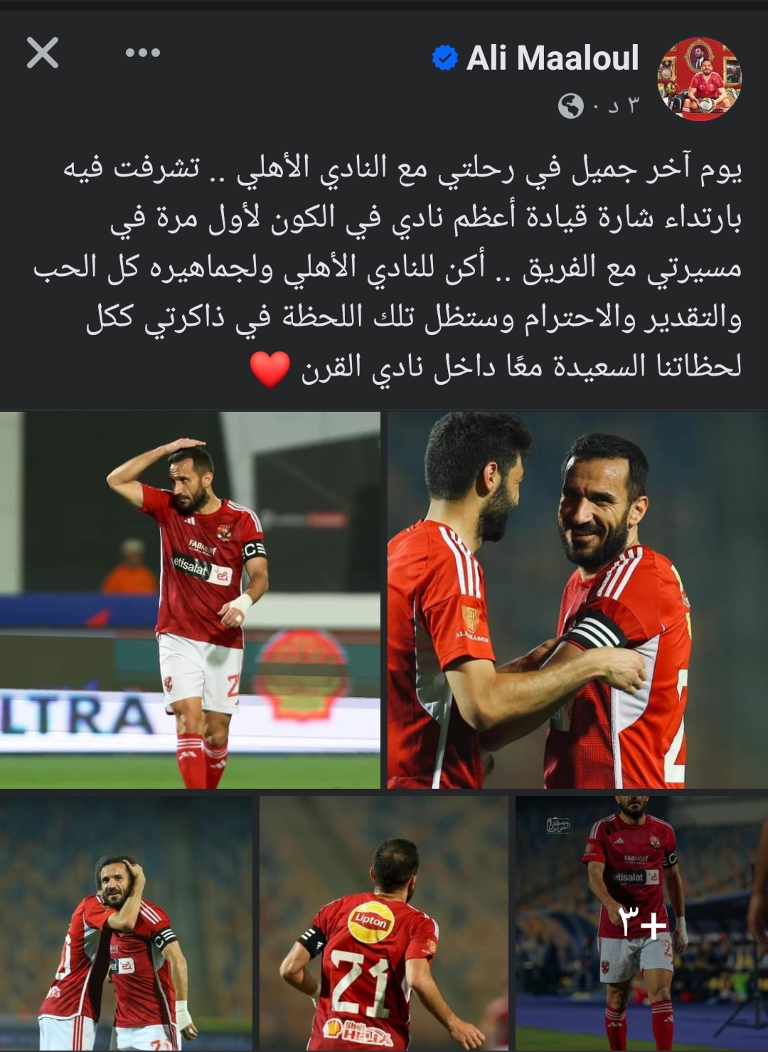 وتابع:”تشرفت فيه بارتداء شارة قيادة أعظم نادي في الكون لأول مرة في مسيرتي مع الفريق، أكن للنادي الاهلي ولجماهيره كل الحب والتقدير والاحترام وستظل تلك اللحظة في ذاكرتي ككل لحظاتنا السعيدة معًا داخل نادي القرن”.