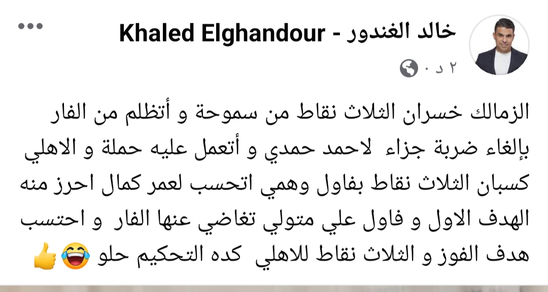 وكتب الغندور عبر حسابه الرسمي على موقع التواصل الإجتماعي” فيس بوك” قائلًا: “الأهلي يواصل انتصاراته ببطولة الدوري المصري بعد فوز بالوقت الضائع علي بلدية المحلة 1/2”.