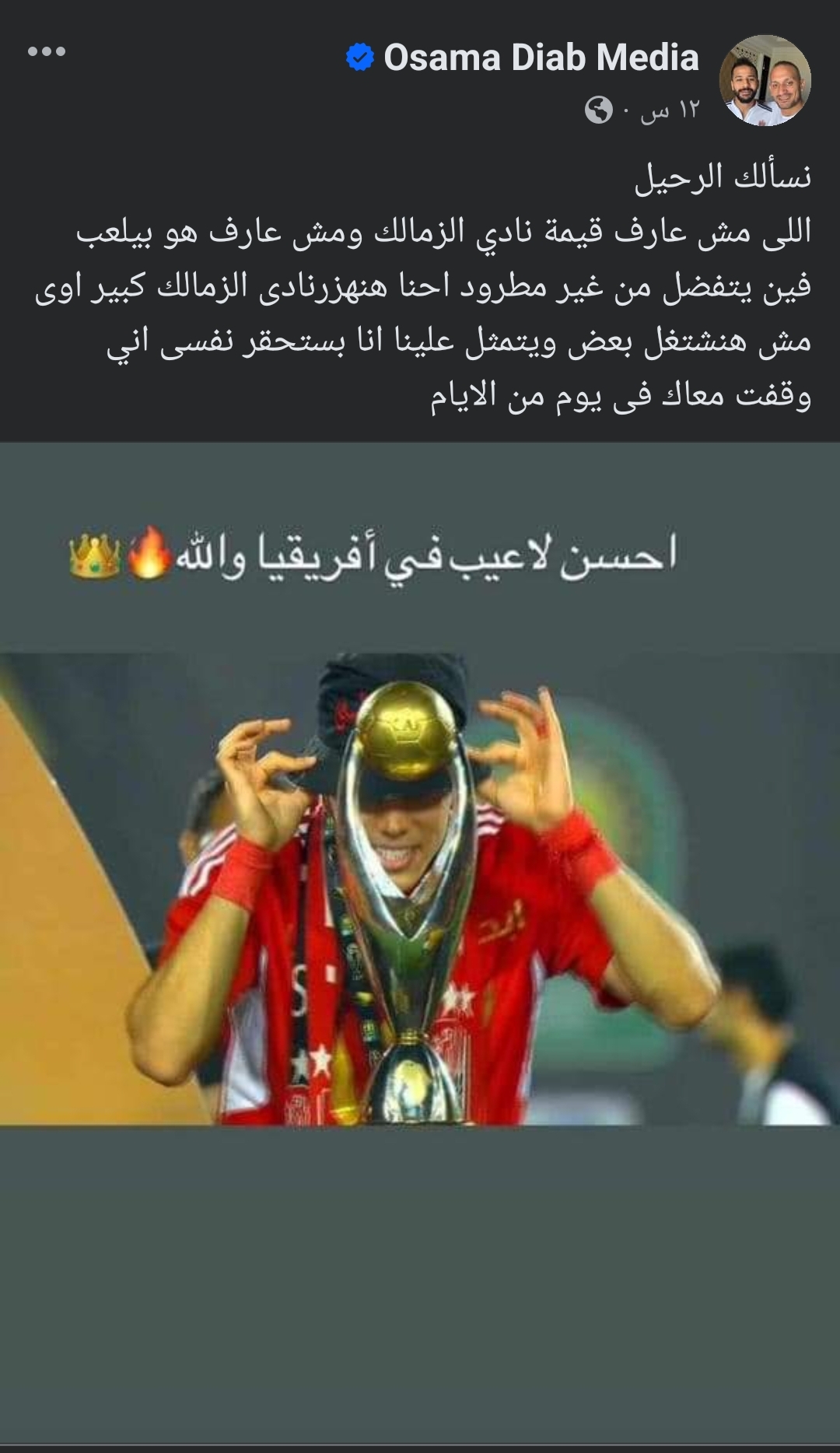 ونشر حافظ، صورة لـ إمام عاشور وهو يحتل بكأس دوري أبطال أفريقيا، عبر حسابه على موقع التواصل الاجتماعي “إنستجرام”، وعلق عليها:”أحسن لاعب في أفريقيا والله”.