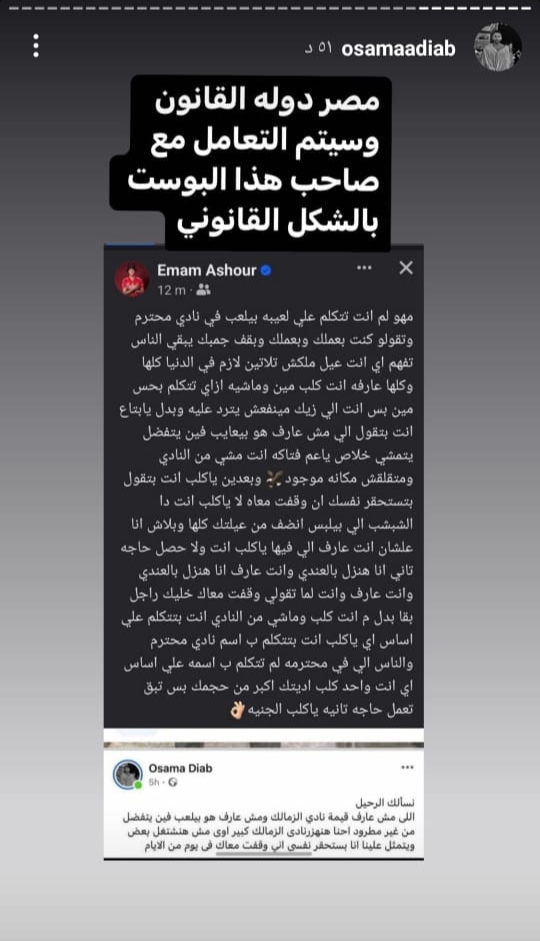 وتوعد مصور نادي الزمالك، نجم الاهلي باللجوء إلى القضاء قائلًا:”مصر دولة القانون وسيتم التعامل مع صاحب هذا البوست بالشكل القانوني”.