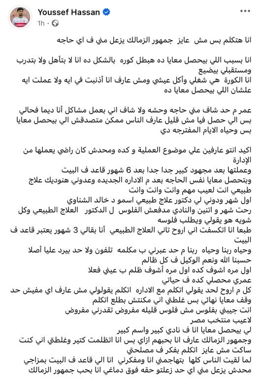 وكتب لاعب الزمالك عبر حسابه الرسمي على موقع التواصل الاجتماعي فيس بوك: “انا بسبب اللي بيحصل معايا ده هبطل كورة انا لا بتأهل ولا بتدرب ومستقبلي بيضيع، الكورة هي شغلي وأكل عيشي ومش عارف انا أذنبت في ايه ولا عملت ايه علشان اللي بيحصل معايا ده “.