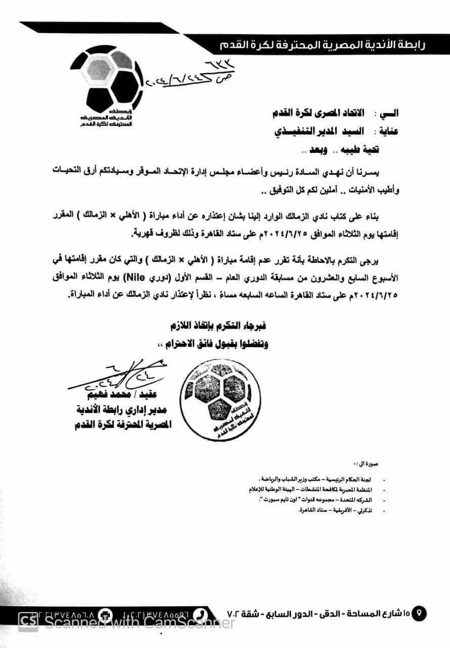 وأكدت الرابطة في خطابها إلى الاتحاد المصري لكرة القدم، أنه تقرر إلغاء مباراة القمة المصرية بين الاهلي والزمالك، في الجولة السابعة والعشرين من بطولة الدوري المصري الممتاز.