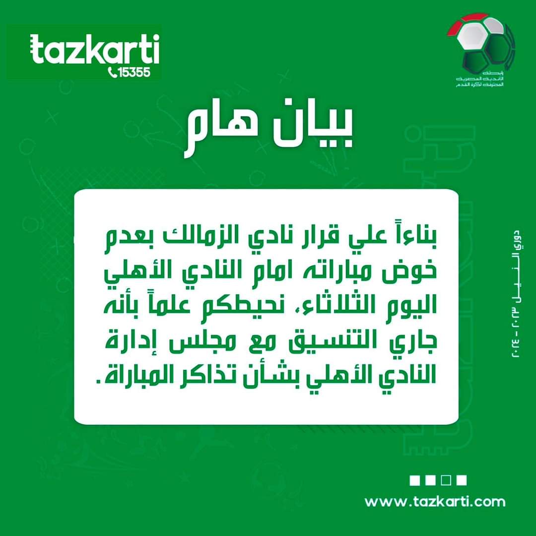 وقالت شركة تذكرتي في بيانها الرسمي عبر حسابها على موقع التواصل الإجتماعي “فيسبوك”: “بناءاً على قرار نادي الزمالك بعدم خوض مباراته امام نظيره الاهلي اليوم الثلاثاء، نحيطكم علماً بأنه جاري التنسيق مع مجلس إدارة القلعة الحمراء بصفته صاحب المباراة بشأن تذاكر اللقاء”.