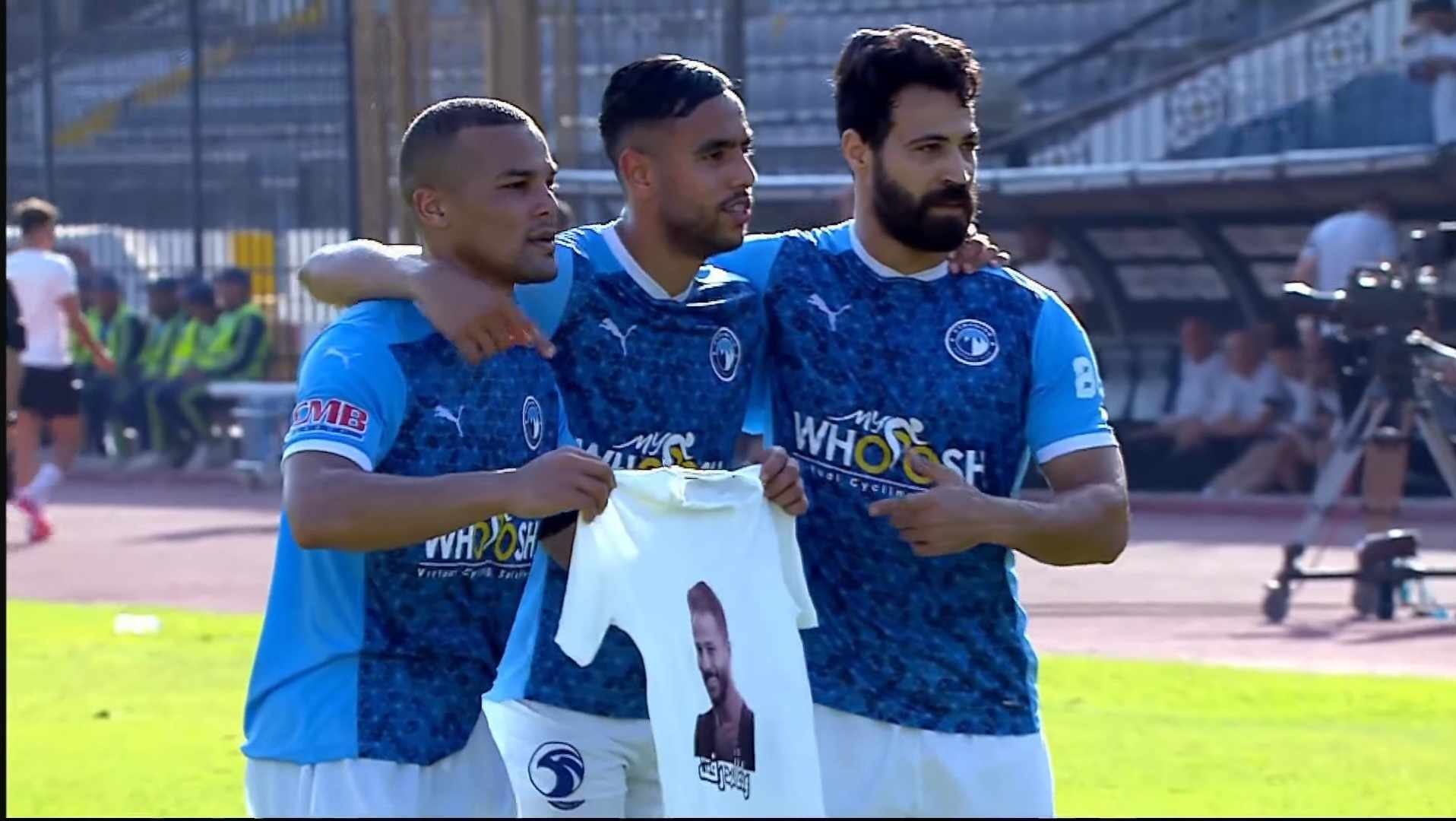 احتفل لاعبو الفريق الأول لكرة القدم بنادي بيراميدز بهدف التقدم أمام الاتحاد السكندري خلال المباراة المقامة حاليًا ضمن منافسات الدوري المصري الممتاز، بقميص الراحل أحمد رفعت.