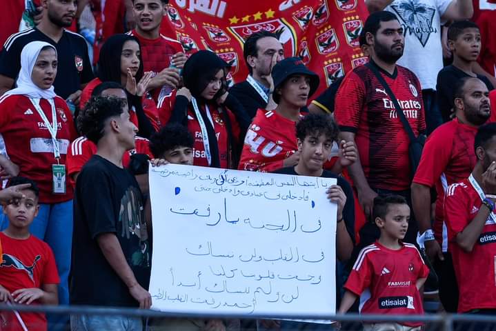 ورفعت جماهير الاهلي لافتات تنعي من خلالها وفاة أحمد رفعت لاعب الزمالك السابق، الذي وافته المنية قبل يومين عن عمر يناهز الـ31 عامًا.