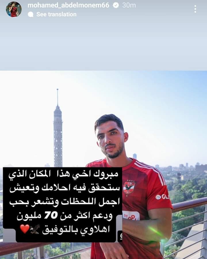 وكتب محمد عبدالمنعم عبر حسابه الرسمي على موقع التواصل الاجتماعي انستجرام: “مبروك أخي هذا المكان الذي ستحقق فيه أحلامك وتعيش أجمل اللحظات وتشعر بحب ودعم أكثر من 70 مليون أهلاوي بالتوفيق”.