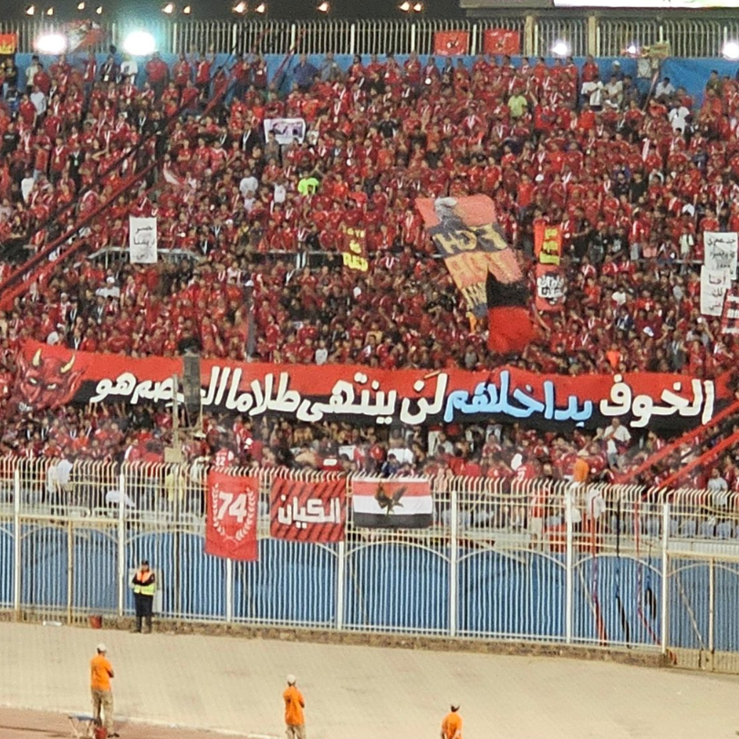 فيما رفع جمهور الاهلي تيفو خلال مباراة بيراميدز مكتوب عليه: “الخوف بداخلهم لن ينتهي.. طالما الخصم هو الاهلي”.