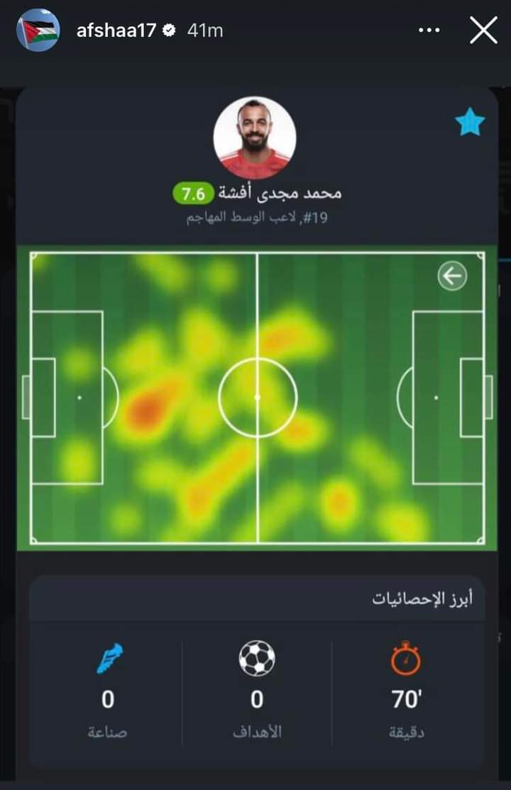 ونشر أفشة صورة عبر حسابه الرسمي على موقع التواصل الاجتماعي إنستجرام يوضح من خلالها تحركاته في المباراة.