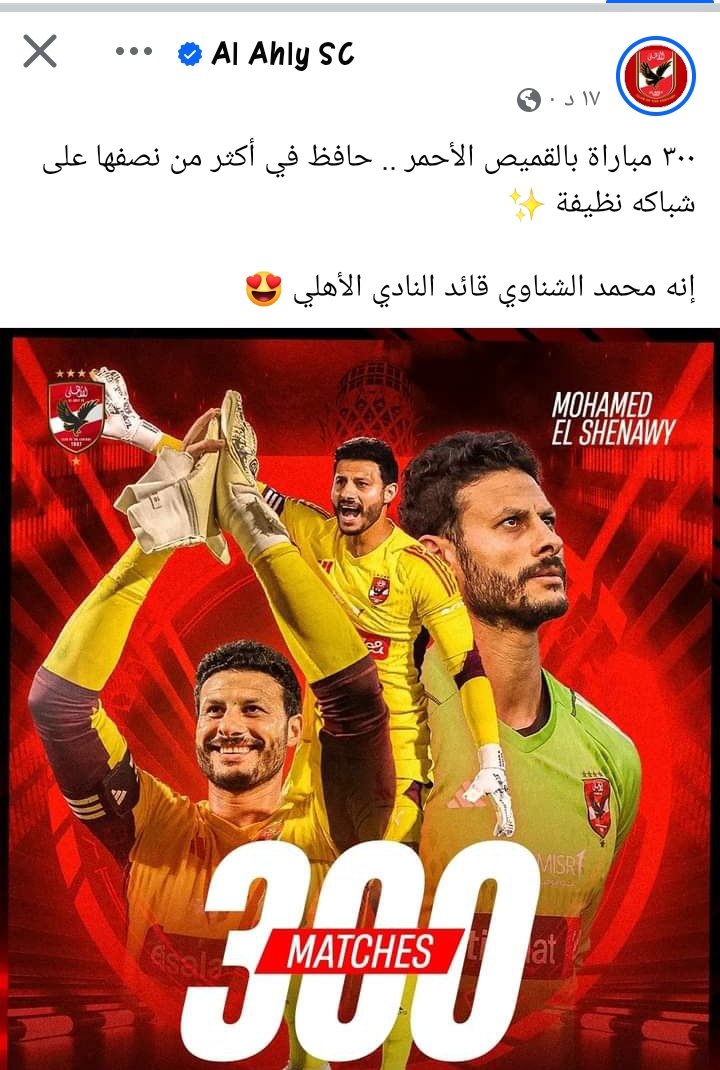 وكتب الاهلي عبر فيس بوك: “٣٠٠ مباراة بالقميص الأحمر .. حافظ في أكثر من نصفها على شباكه نظيفة، إنه محمد الشناوي قائد النادي الاهلي “.