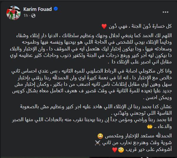 وفي أول رد فعل له، قال كريم، عبر حسابه الرسمي على “فيسبوك”:كل خسارة دُونَ الجنة، فهي دُون”.