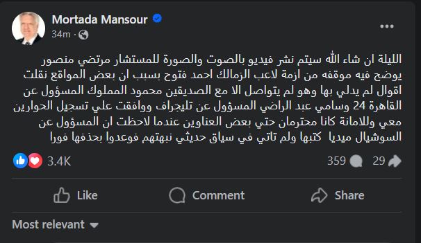 وقال مرتضى منصور، عبر حسابه على “فيسبوك”: “الليلة ان شاء الله سيتم نشر فيديو بالصوت والصورة للمستشار مرتضي منصور يوضح فيه موقفه من ازمة لاعب الزمالك احمد فتوح بسبب ان بعض المواقع نقلت أقوال لم يدلي بها”.