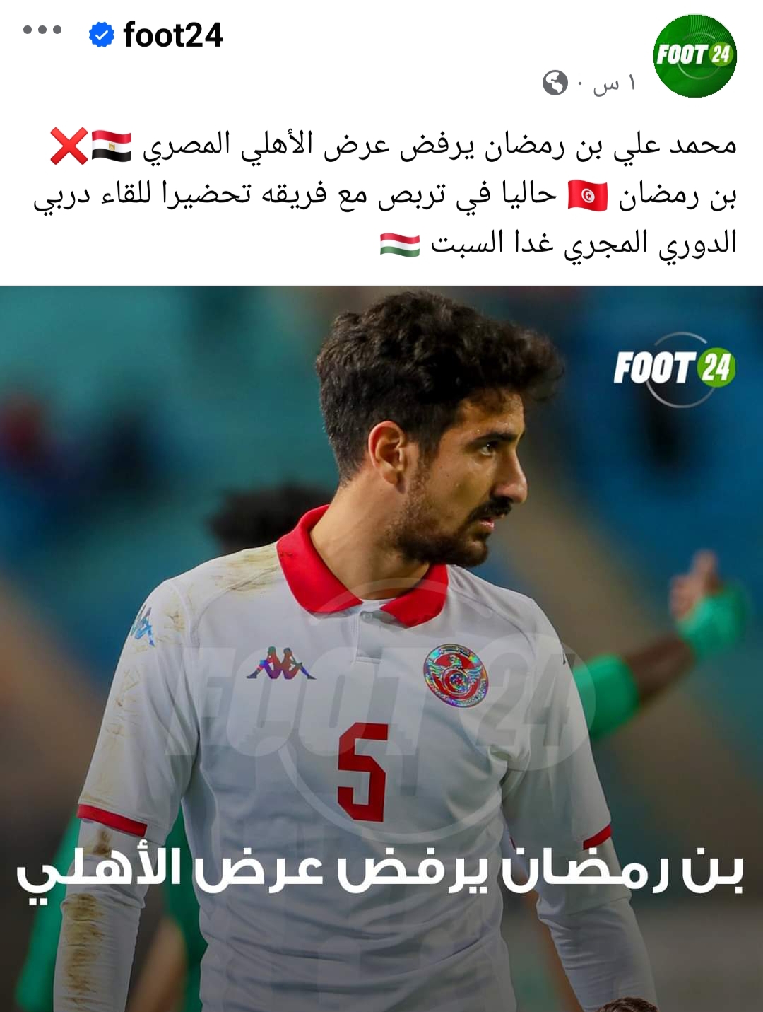 ووفقا لما ذكره موقع “foot24” التونسي، فإن محمد علي بن رمضان لاعب فرينكفاروزي المجري، حسم موقفه من الانضمام إلى صفوف المارد الأحمر، خلال الميركاتو الصيفي الجاري.