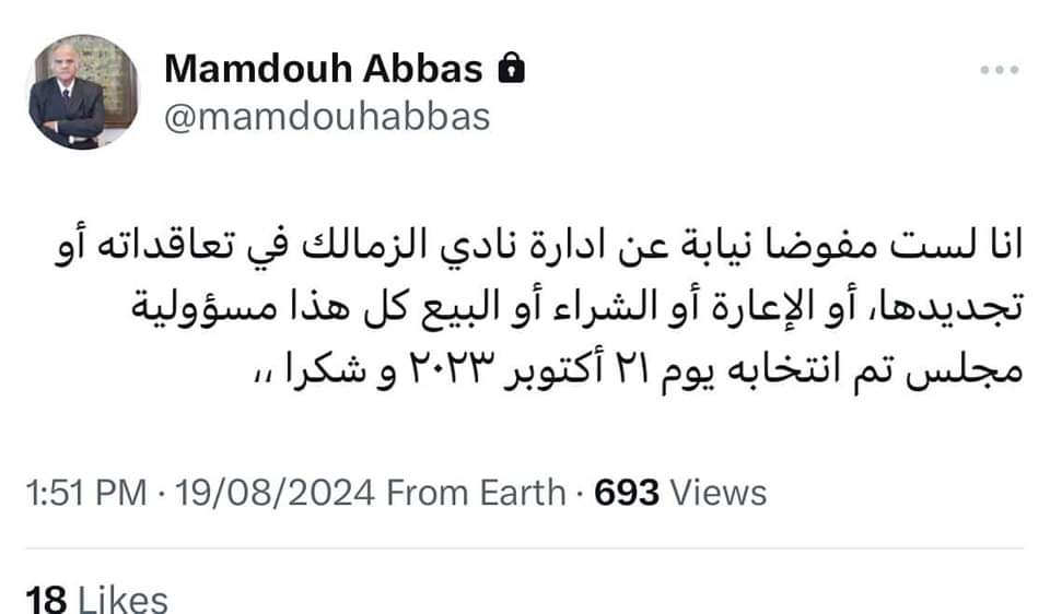 وكتب عباس في تغريدة عبر منصة “x”: ”أنا لست مفوضا نيابة عن إدارة نادي الزمالك في تعاقداته أو تجديدها، أو الإعارة أو الشراء أو البيع”.