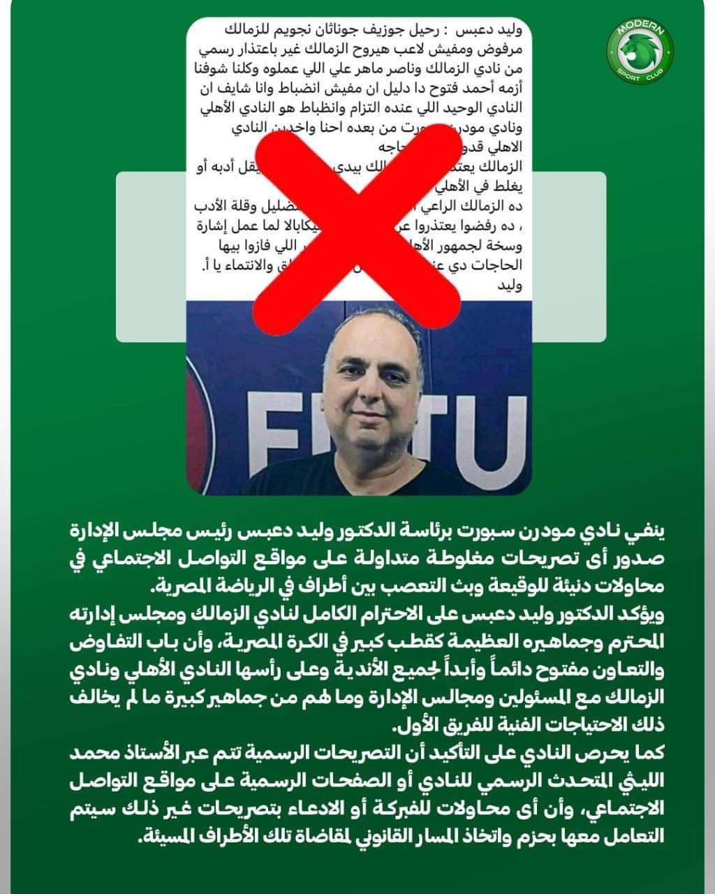 ونفى دعبس رئيس نادي مودرن سبورت ما تم تداوله خلال الساعاا القليلة الماضية عبر مواقع التواصل الإجتماعي، من تصريحات مغلوطة.