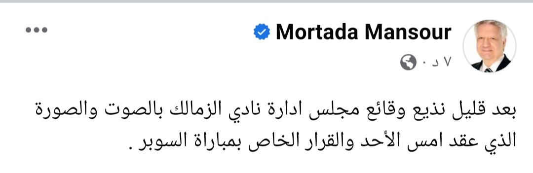 وكتب مرتضى منصور عبر حسابه بموقع التواصل الاجتماعي “فيس بوك”: “بعد قليل نذيع وقائع مجلس ادارة نادي الزمالك بالصوت والصورة الذي عقد أمس الأحد والقرار الخاص بمباراة السوبر”.
