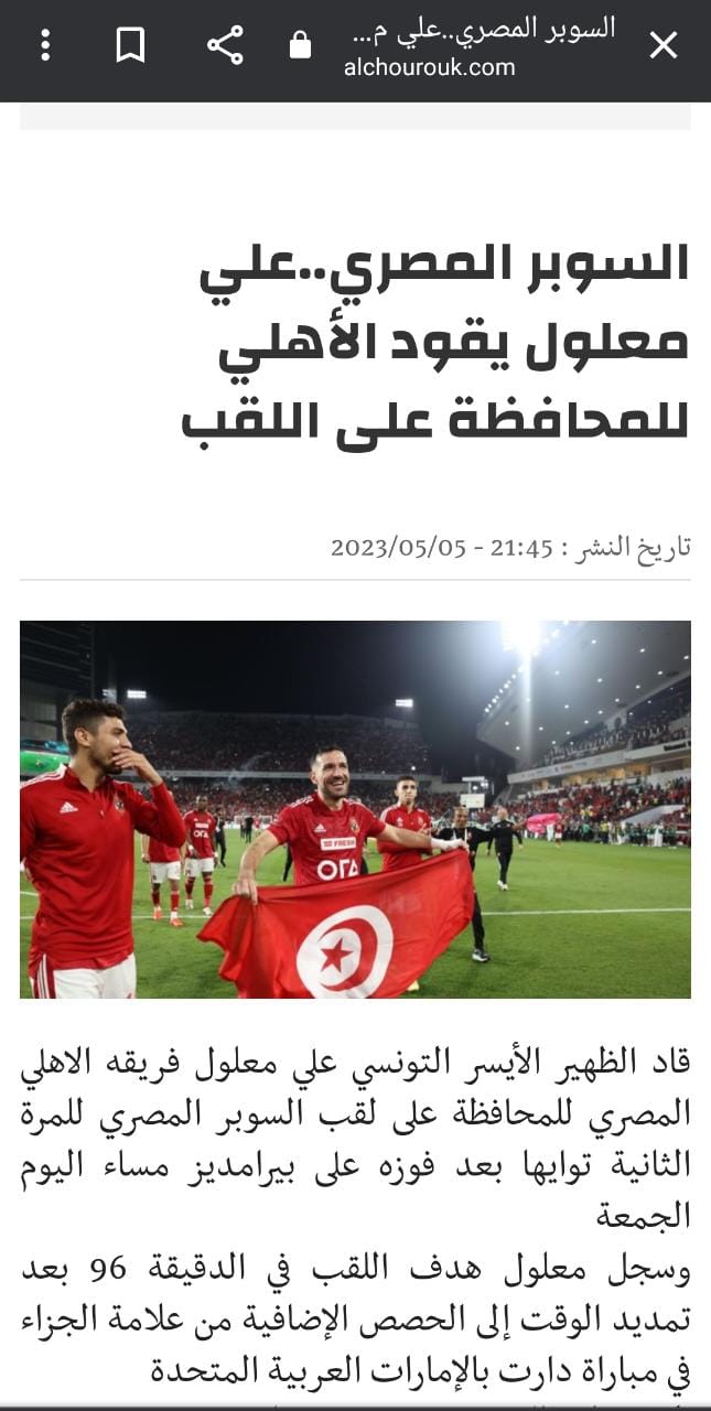 بينما قالت صحيفة “الشروق” التونسية:”السوبر المصري.. علي معلول يقود الأهلي للمحافظة على اللقب”.