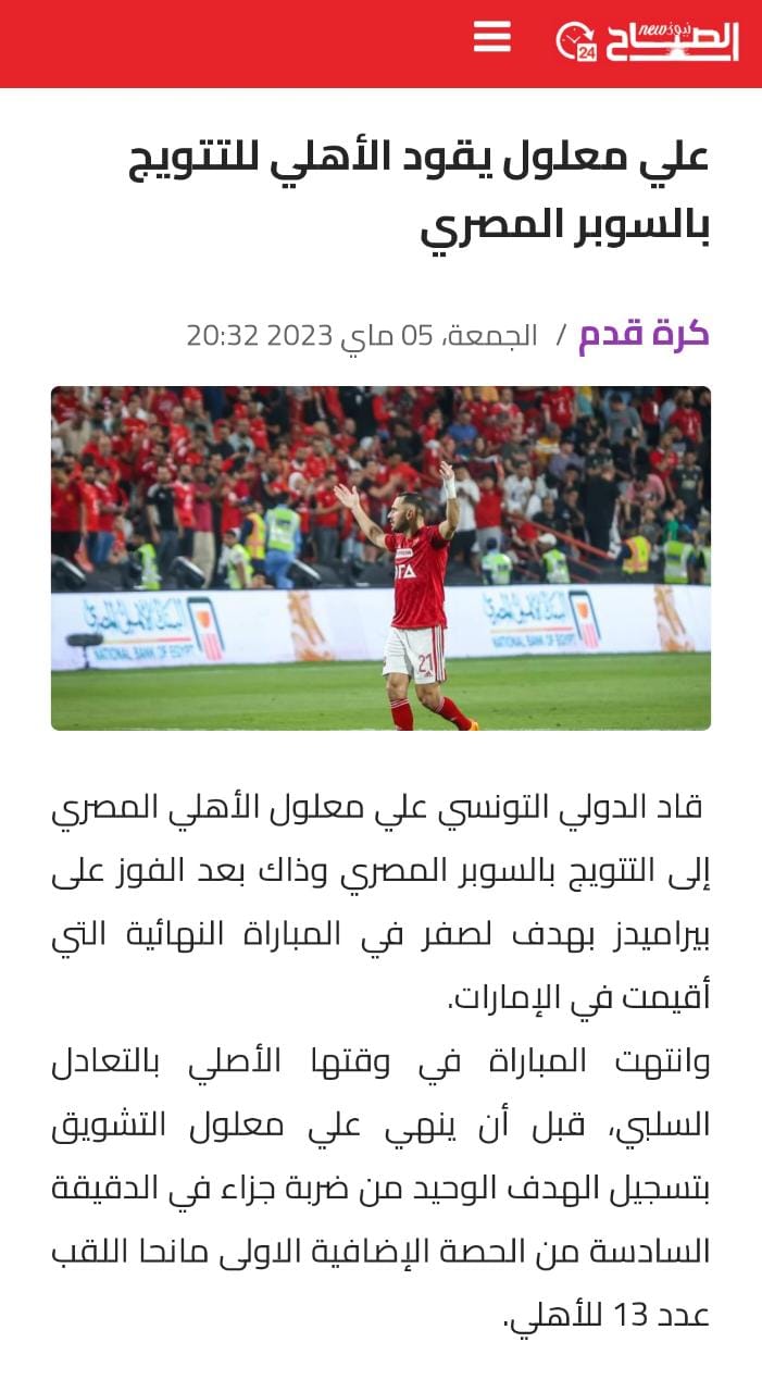وعنونت صحيفة “الصباح التونسية”:”علي معلول يقود الأهلي للتتويج بالسوبر المصري”.