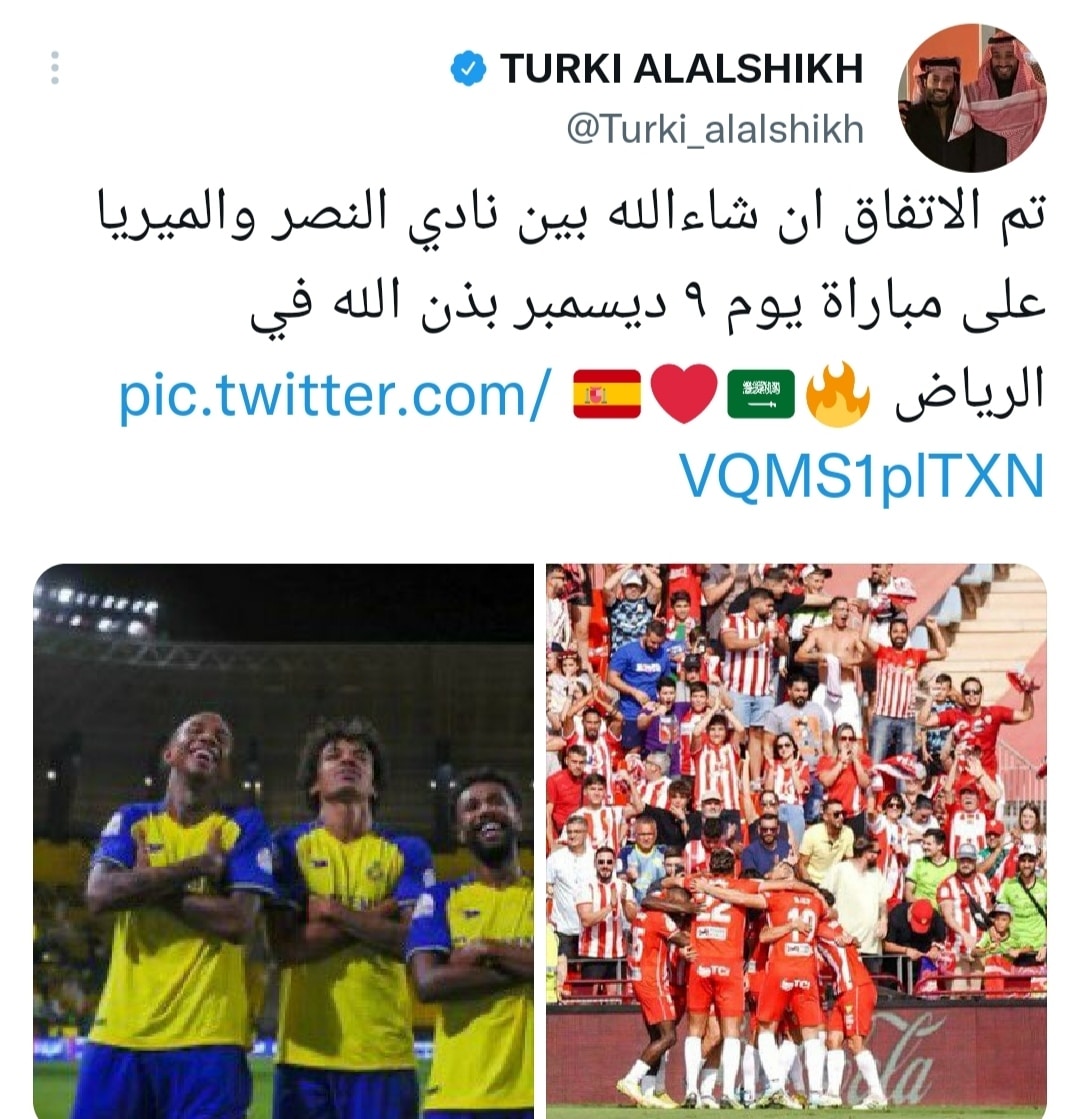 وكتب آل الشيخ عبر حسابه الشخصي بموقع التواصل الاجتماعي “تويتر”:”تم الاتفاق إن شاءالله بين نادي النصر وألميريا على مباراة ودية”.
