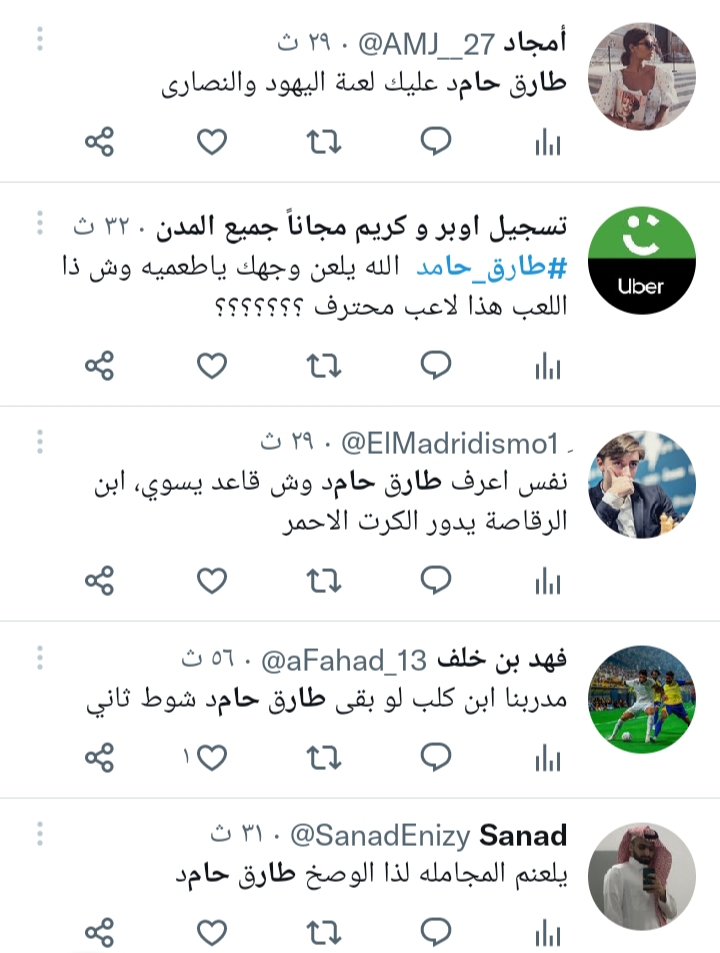 في الجهة المقابلة، هاجمت جماهير الفريق الأول لكرة القدم بنادي اتحاد جدة، لاعبها طارق حامد، بسبب تدخلاته العنيفة، وذلك خاصة أنه قد يفقد ناديه لاعبًا ويلعب فريقه منقوصًا، في حال حصوله على طرد على إثر هذه التدخلات.