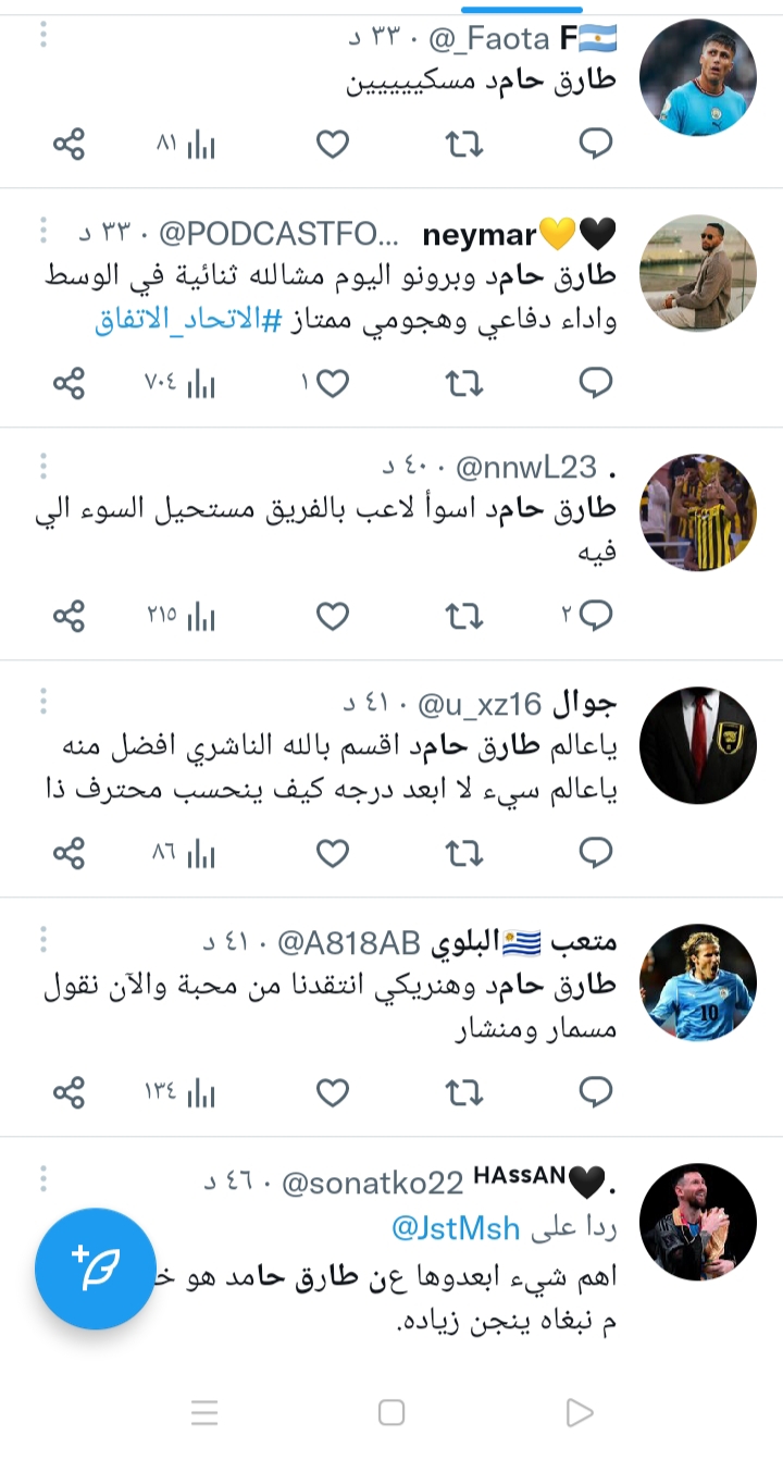 وهاجمت جماهير اتحاد جدة، طارق حامد لاعب وسط الفريق الأول لكرة القدم بالنادي، بسبب أدائه المنخفض خلال مواجهة الاتفاق، حسب ما وصفه الجماهير الاتحادية.