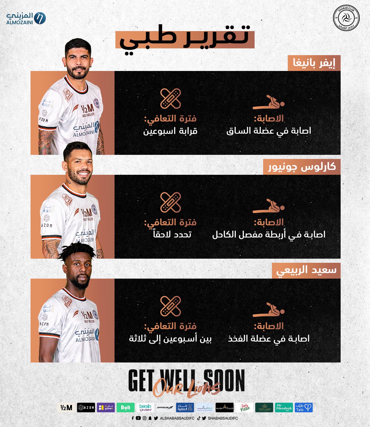 كما كشف نادي الشباب عبر حسابه الرسمي حجم إصابة ثنائي الفريق البرازيلي كارلوس جونيور وسعيد الربيعي.