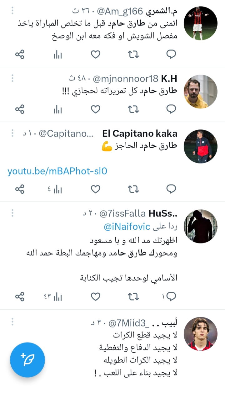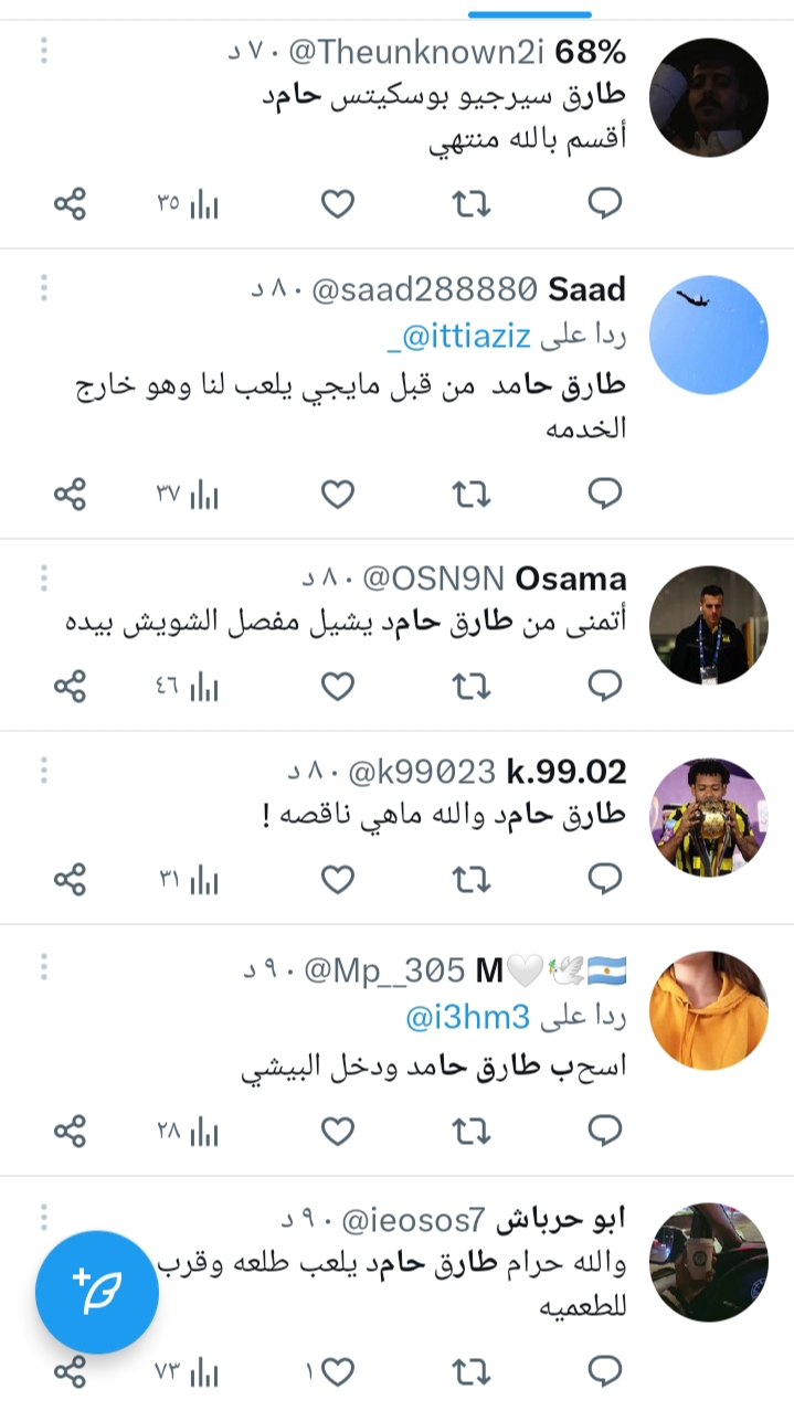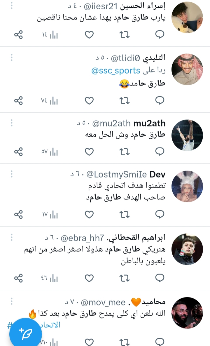 وأبدى جماهير اتحاد جدة، استيائهم من مستوى طارق حامد، وتمريراته خلال مباراة الفريق أمام الفيحاء، في المباراة المقامة حاليًا بينهما، ليطالبوا برحيله عن الفريق.